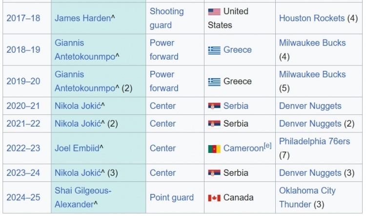 17-18賽季至本賽季MVP一覽:哈登、字母哥、字母哥、約基奇、約基奇、恩比德、約基奇、亞歷山大