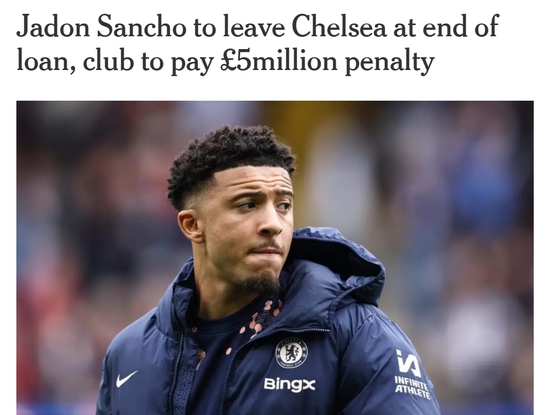 25歲桑喬租借合同中有2500萬鎊的買斷條款,由于切爾西不會(huì)觸發(fā)該條款,藍(lán)軍將向曼聯(lián)支付500萬鎊違約金。桑喬將在今夏另謀下家。