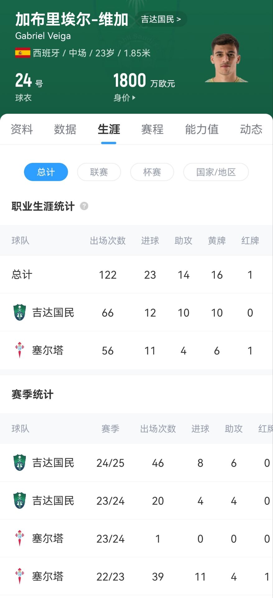 維加2023年以3000萬(wàn)歐轉(zhuǎn)會(huì)費(fèi)從塞爾塔加盟吉達(dá)國(guó)民,至今為吉達(dá)國(guó)民出戰(zhàn)66場(chǎng)比賽12球10助。