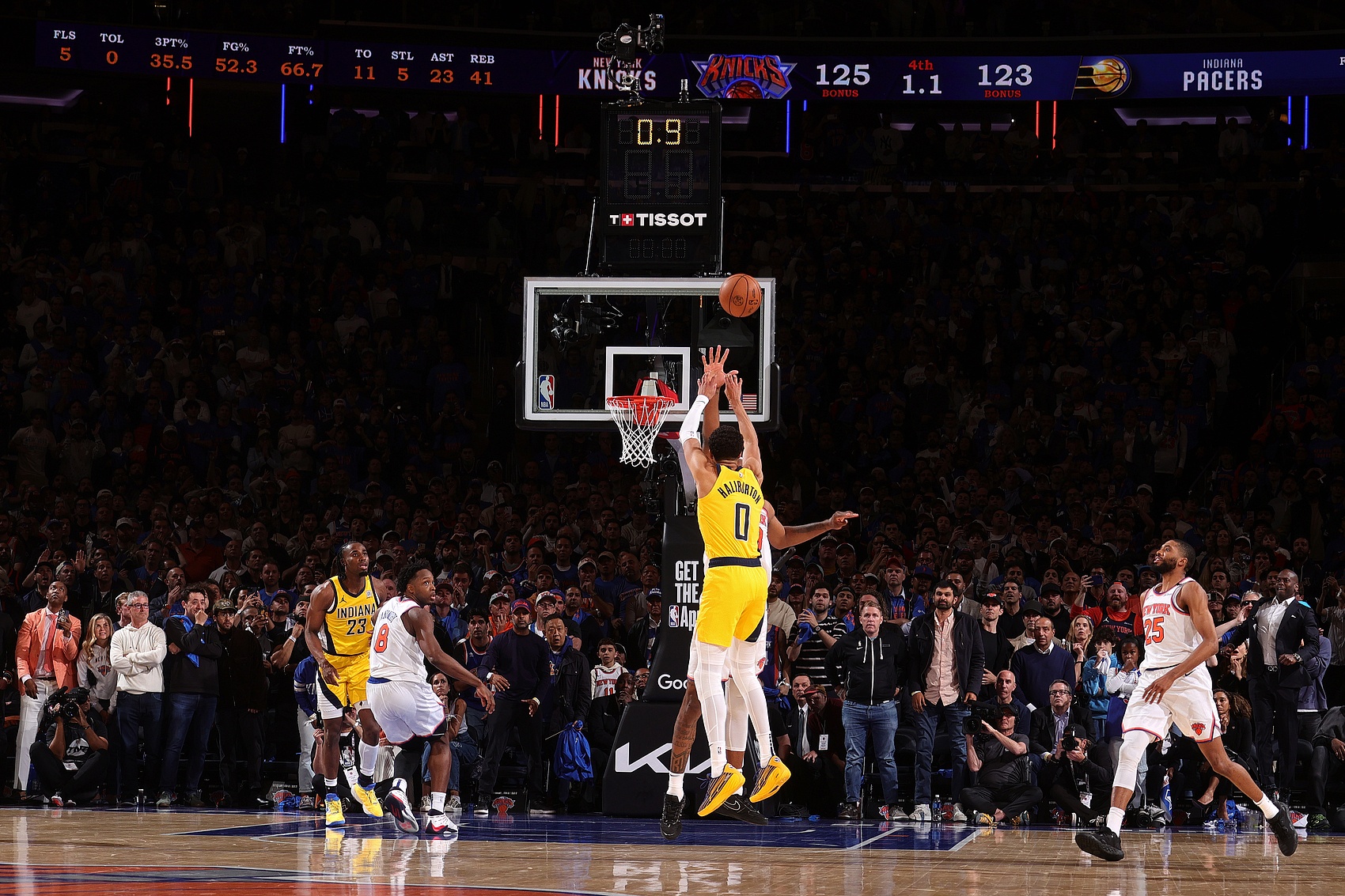 籃球懸停在空中,宛如盧浮宮墻上懸掛的油畫。它對抗著重力,彈得如此之高,以至于TNT電視臺的廣角轉(zhuǎn)播鏡頭中都失去了它的蹤跡。與其說是油畫,不如說更像一顆流星,轉(zhuǎn)瞬即逝。但與那些天體巖石不同,這顆更接地氣的球總會(huì)回落。當(dāng)籃球最終以不可思議的角度墜落,刷網(wǎng)而入扳平東部決賽G1的比分,它成為了貫穿整個(gè)季后賽的定理最新佐證:泰瑞斯-哈利伯頓已正式躋身聯(lián)盟前5巨星之列。