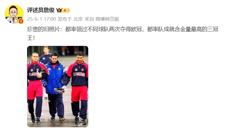詹俊在社媒寫道:珍貴的舊照片,都率領過不同球隊兩次奪得歐冠,都率隊成就含金量最高的三冠王! ???