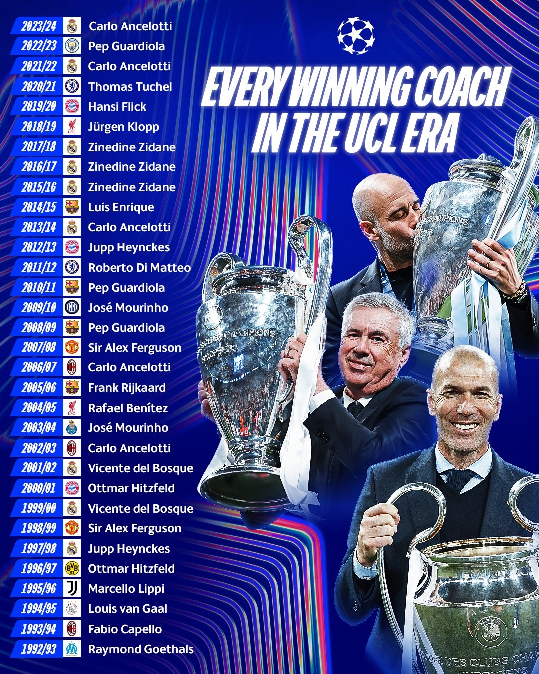 歐冠官方列出92/93賽季-23/24賽季的歐冠冠軍主帥,發(fā)問(wèn):你最喜歡哪一個(gè)?