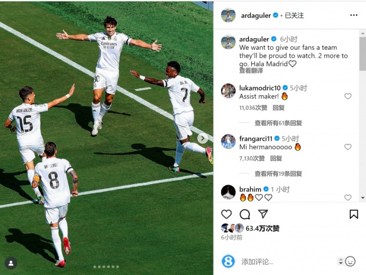 居勒爾社媒曬出與隊(duì)友一起慶祝的照片,配文:“我們想成為球迷引以為豪的球隊(duì),還剩兩場(chǎng),Hala Madrid!”