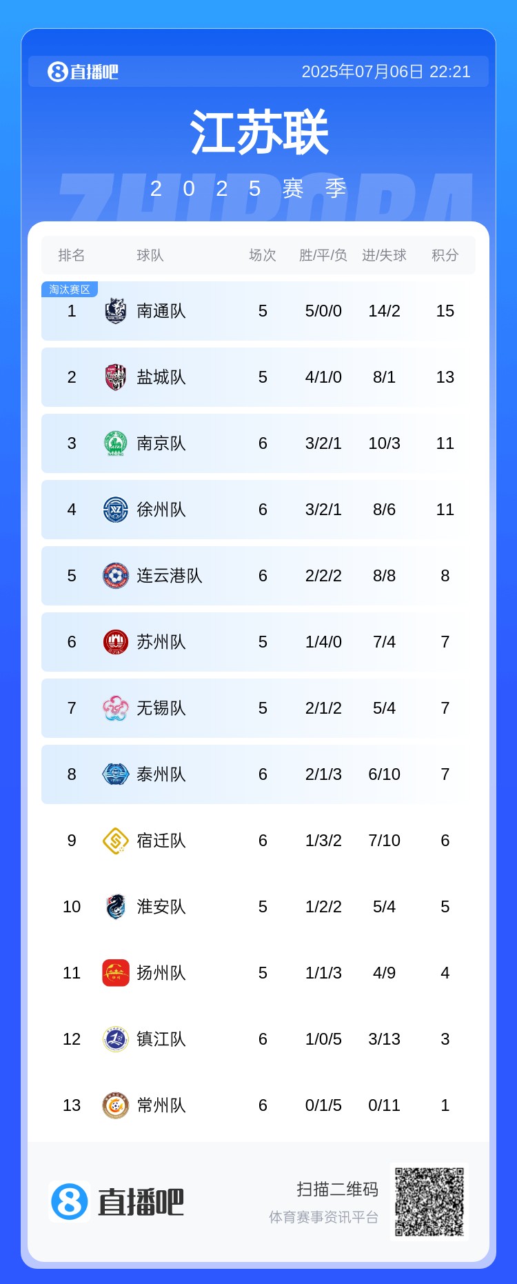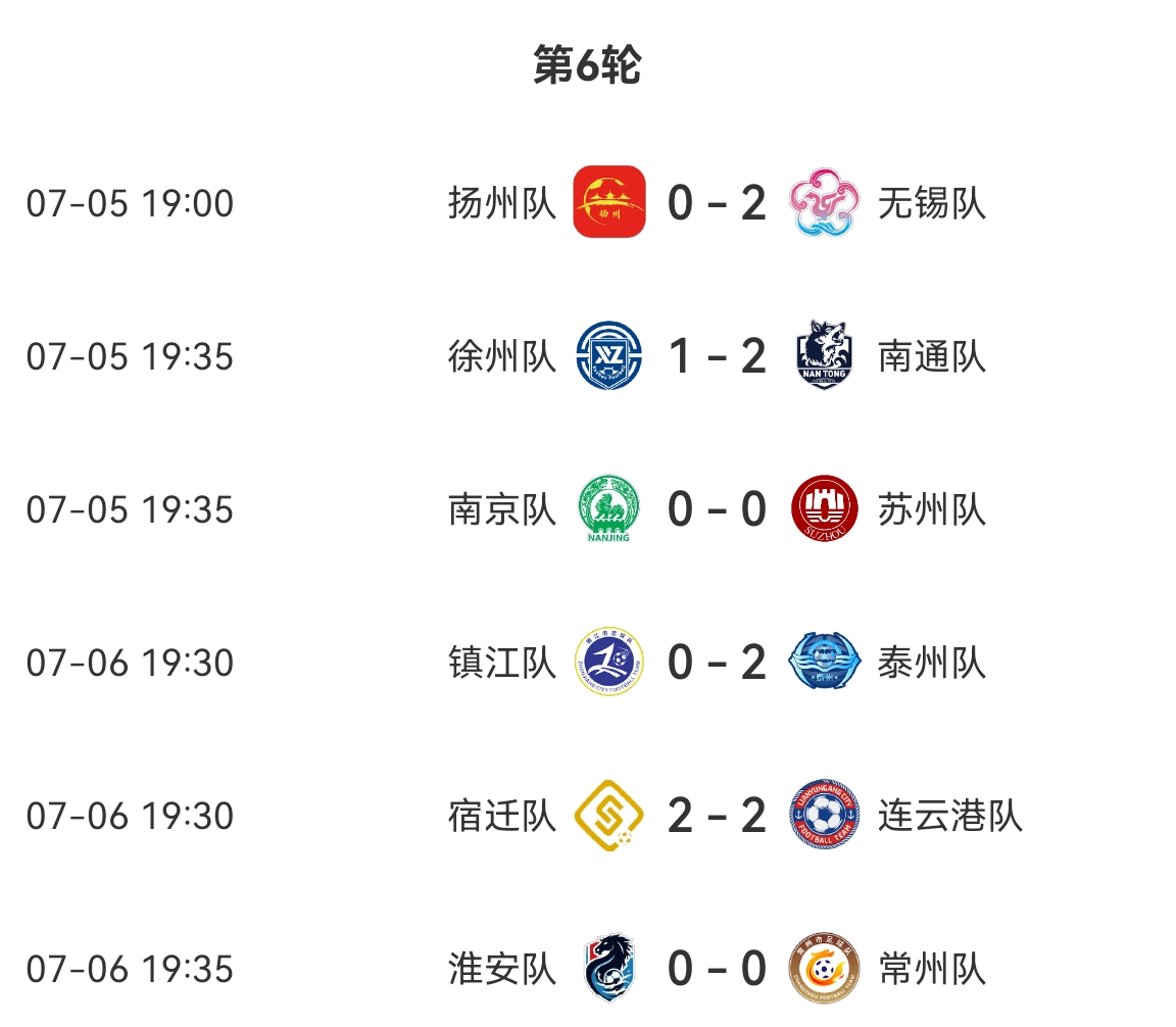 07月06日訊 江蘇城市聯(lián)賽結(jié)束第6輪6場比賽的爭奪,南通繼續(xù)全勝,常州拿到首分,南京主場人數(shù)創(chuàng)紀(jì)錄0比0戰(zhàn)平蘇州。