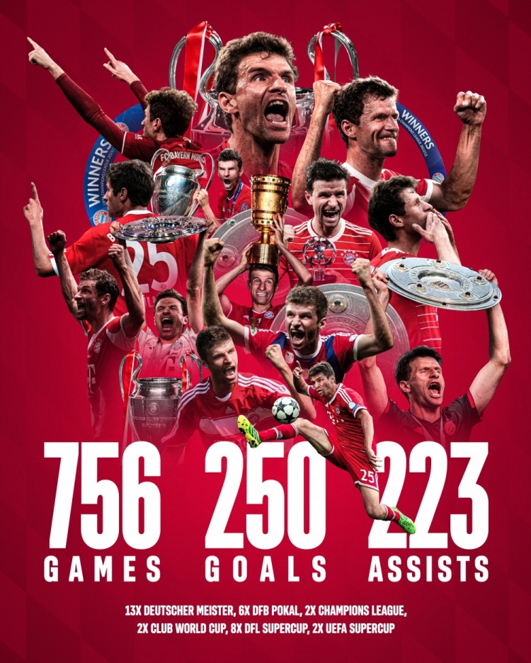穆勒代表拜仁征戰(zhàn)756場(chǎng),打進(jìn)250球,貢獻(xiàn)223助攻。