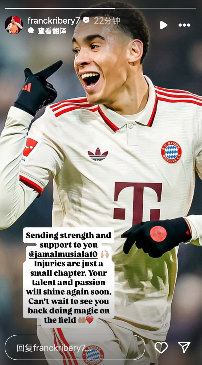 里貝里寫(xiě)道:向你致以力量和支持?jamalmusiala10,傷病只是個(gè)小插曲,你的才華和熱情很快就會(huì)再次閃耀。