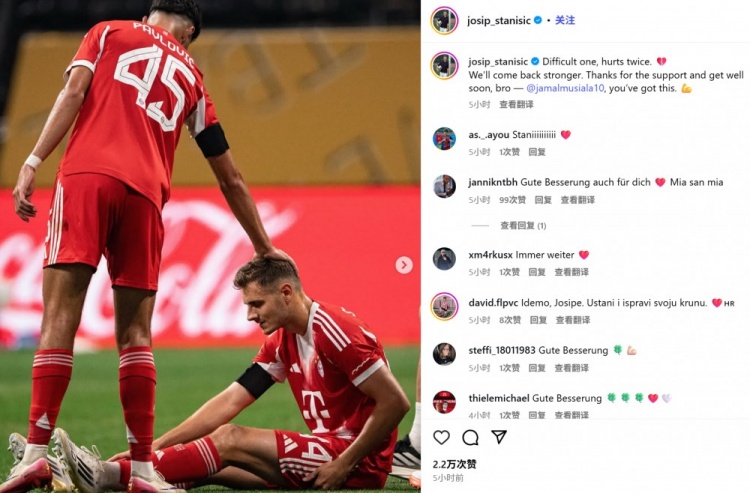斯坦尼西奇也在今日通過社媒曬出自己的傷退照片,并感嘆:“一場艱難的比賽,兩次受傷。我們會以更強的姿態(tài)回歸。感謝球迷們的支持。兄弟,早日康復(fù)@穆西亞拉,你可以做到!”