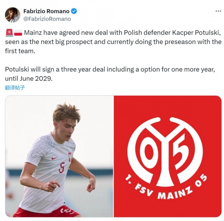 17歲中衛(wèi)波圖爾斯基與美因茨的合同2026年到期,羅馬諾透露,雙方已經(jīng)就續(xù)約至2028年達(dá)成協(xié)議,其中包含延長至2029年的選項(xiàng)。美因茨非??春貌▓D爾斯基的未來,這位波蘭小將正隨一線隊(duì)進(jìn)行季前訓(xùn)練。