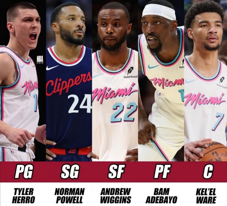 在24-25賽季,這五人的場均得分分別是:希羅(23.9分)、鮑威爾(21.8分)、維金斯(18分)、阿德巴約(18.1分)、韋爾(9.3分)