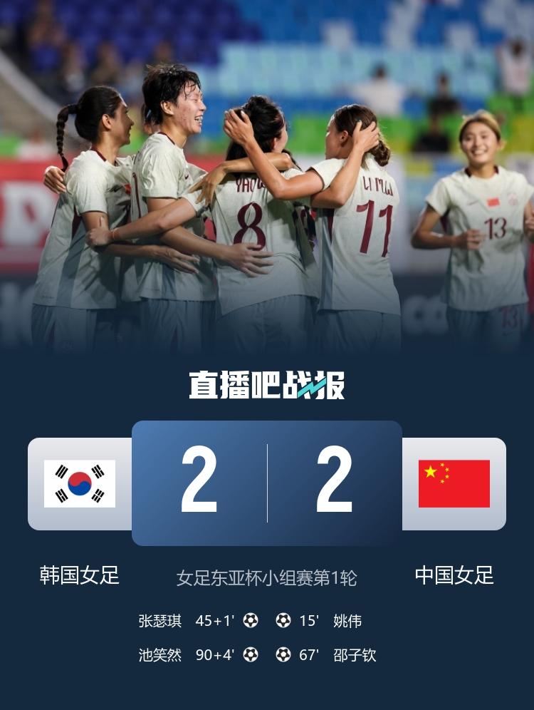 7月9日訊 北京時(shí)間7月9日19:00,女足東亞杯小組賽第一輪中國(guó)女足挑戰(zhàn)韓國(guó)女足的比賽在水原世界杯球場(chǎng)進(jìn)行,上半場(chǎng)姚偉遠(yuǎn)射世界波首開(kāi)記錄,潘紅艷獻(xiàn)精彩撲救,姜綵林失單刀,張瑟琪補(bǔ)射扳平,半場(chǎng)結(jié)束,中國(guó)女足1-1韓國(guó)女足。下半場(chǎng)王霜失良機(jī),姚偉助攻邵子欽頭球破門(mén),潘紅艷失誤險(xiǎn)送禮,池笑然遠(yuǎn)射絕平,最終中國(guó)女足2-2韓國(guó)女足無(wú)緣開(kāi)門(mén)紅,中國(guó)女足下場(chǎng)對(duì)手將是中國(guó)臺(tái)北女足。