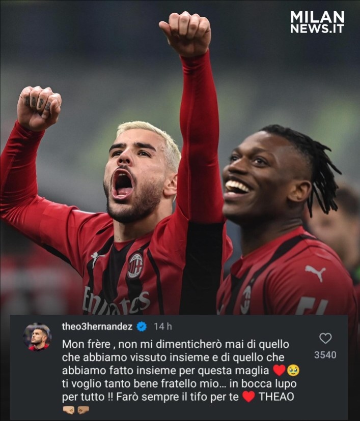 這是特奧對萊奧的寄語,最后用上了著名的合成詞“THEAO”,將兩人的名字融合在一起,就像他們這些年在米蘭場上并肩作戰(zhàn)一樣。