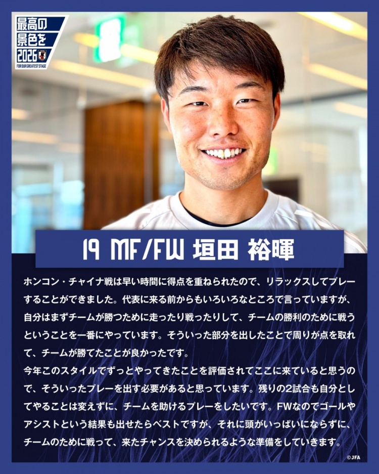 “今年我認(rèn)為自己因?yàn)閳猿诌@樣的足球風(fēng)格而獲得了好評,從而獲得了入選日本國家隊的機(jī)會,因此接下來繼續(xù)這樣的表現(xiàn)是有必要的。剩余兩場比賽自己也會繼續(xù)保持,想盡可能幫到球隊。作為前鋒,能取得進(jìn)球或助攻當(dāng)然是最好的,但也不能滿腦子都是這些,要把球隊放在第一位,同時時刻做好準(zhǔn)備,等待機(jī)會的來臨?!?/span>
