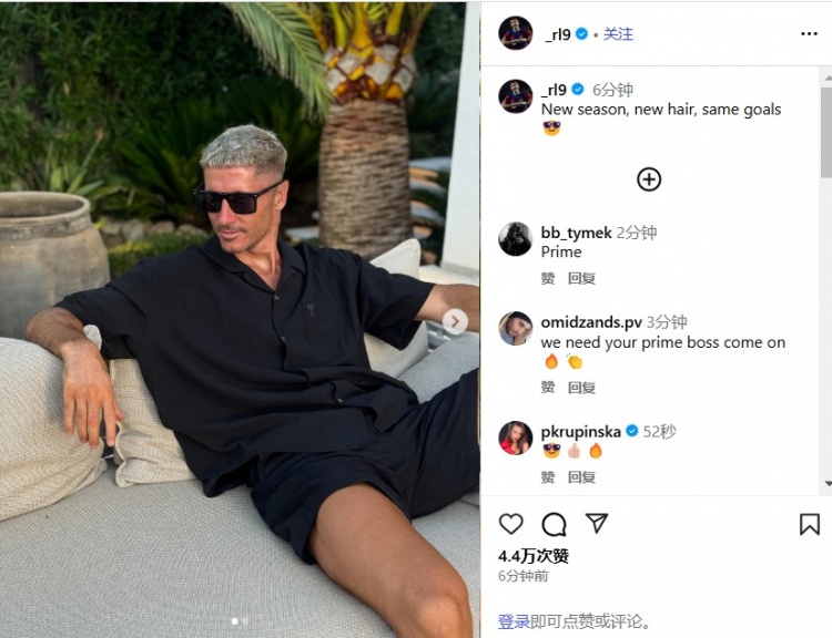 7月11日訊 巴薩前鋒萊萬已經(jīng)開啟了季前備戰(zhàn)工作,在社交媒體上,波蘭老將曬出了自己新造型照片,他將頭發(fā)染成了“奶奶灰”顏色并佩戴了墨鏡,看起來相當帥氣。萊萬配文道:新賽季,新發(fā)型,同樣的進球。