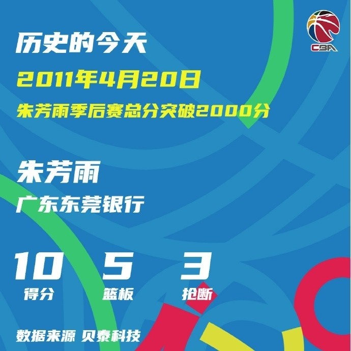 2011年4月20日,2010-2011賽季CBA聯(lián)賽季后賽總決賽第3場,廣東東莞銀行85-118不敵新疆廣匯汽車。該場對決,朱芳雨出場時間超過35分鐘,全場10投4中,其中三分球7投2中,得到10分5籃板3搶斷。此役戰(zhàn)罷,朱芳雨CBA聯(lián)賽季后賽生涯總得分就此達到2001分,成為史上第三位季后賽總得分突破2000分的球員。