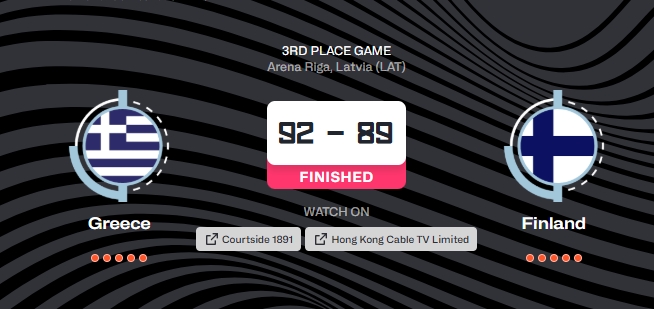 09月14日訊 男籃歐錦賽季軍賽,希臘92-89險(xiǎn)勝芬蘭,奪得本屆歐錦賽季軍!