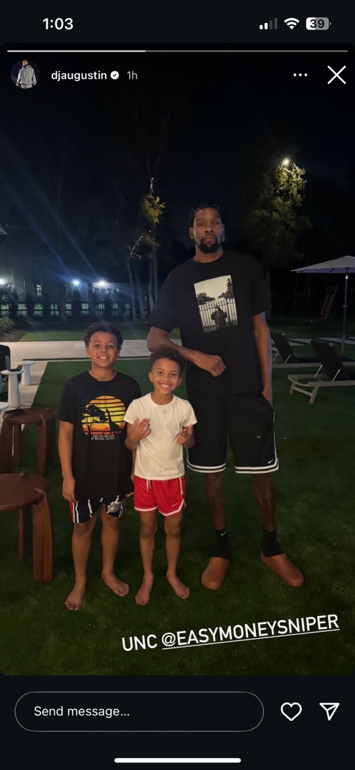 09月15日訊 現(xiàn)火箭隊球探、前火箭球員DJ-奧古斯汀今日更新Instagram,曬出了自己倆兒子和杜蘭特的合影,并寫道:“杜叔叔@杜蘭特?!?/p>