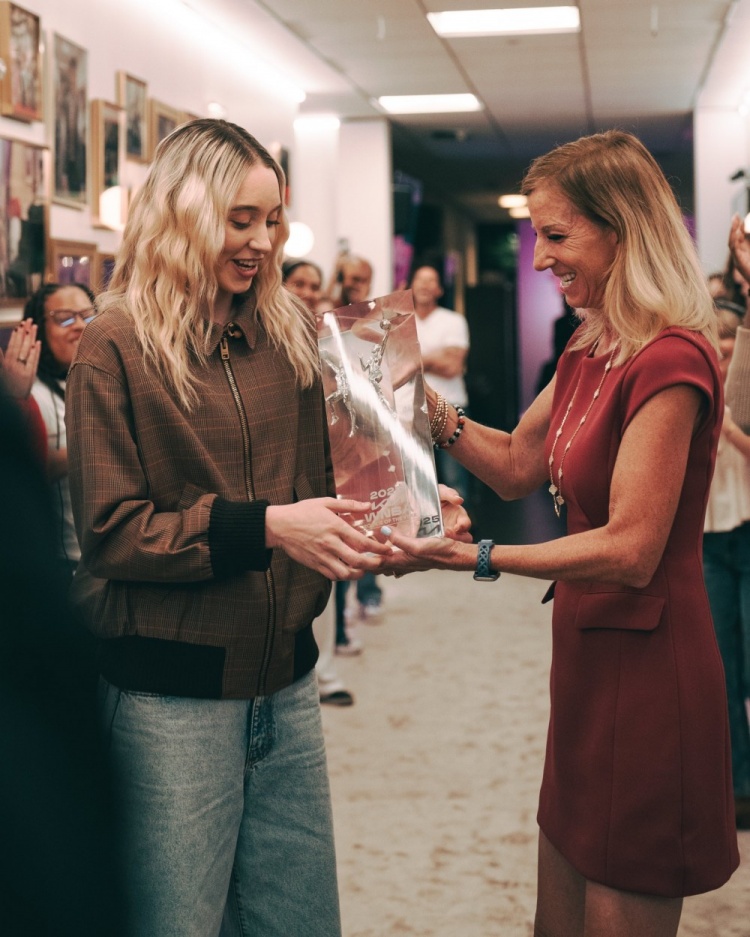 而在公布獲獎的同時,佩奇-布克斯也出現(xiàn)在了《The Jennifer Hudson Show》節(jié)目中,也在這從WNBA總裁凱茜-恩格波特手中接過了最佳新秀獎杯。