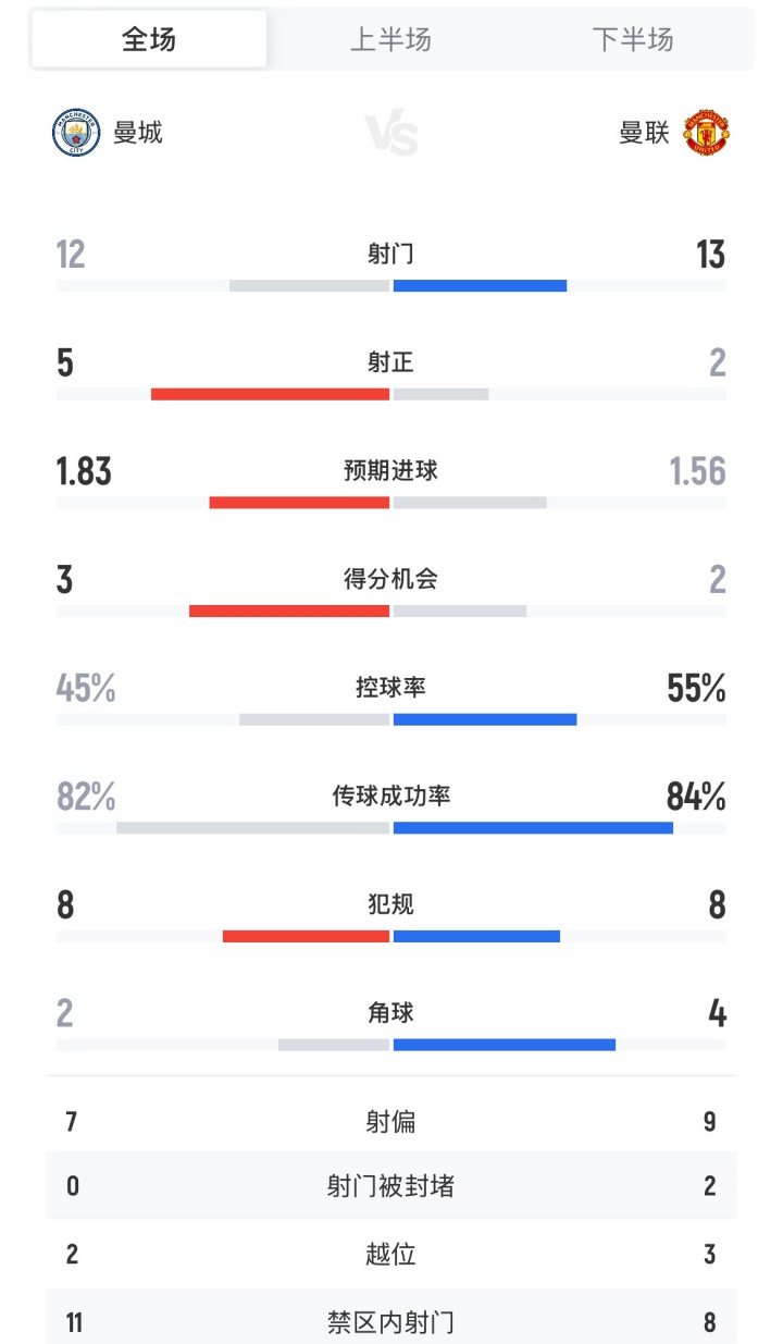 曼城全場12腳射門5次射正打進3球,預(yù)期進球1.83。曼聯(lián)下半場射門、控球率都有提升,全場13射2正,預(yù)期進球1.56。