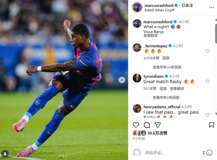本場比賽拉什福德首發(fā)出戰(zhàn),送出一次助攻,這也是他巴薩生涯首次在正式比賽參與進球,賽后他也在社媒曬照慶祝,配文寫道:“多棒的夜晚,巴薩加油!”