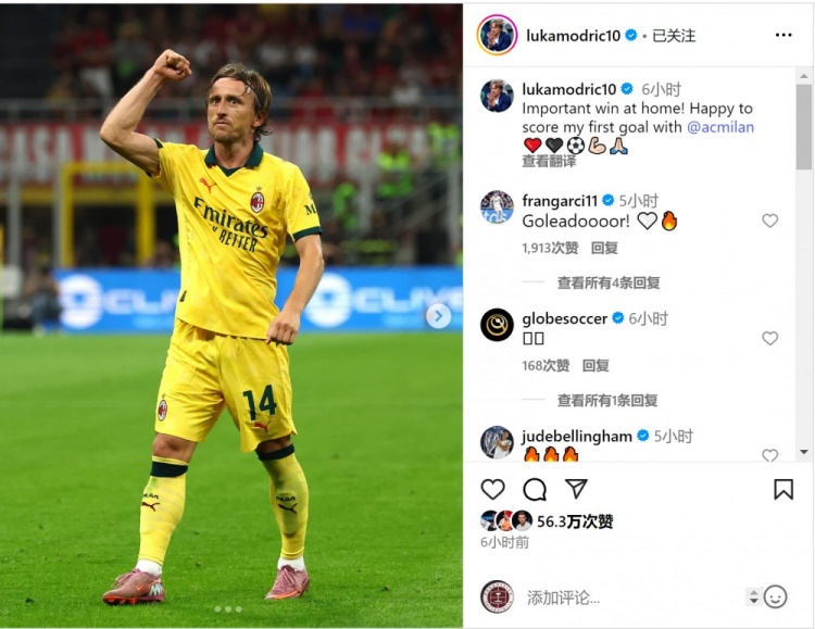 莫德里奇社媒曬出比賽照片,并寫道:“在主場(chǎng)取得重要?jiǎng)倮?!很高興攻入我在米蘭的首粒進(jìn)球?!?/p>