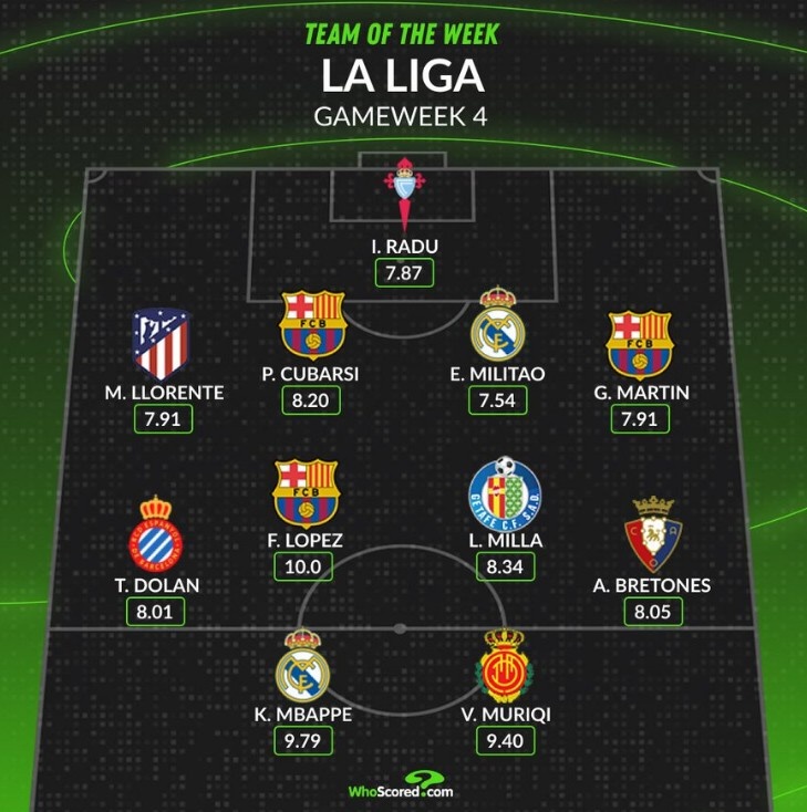 9月16日訊 本輪西甲戰(zhàn)罷,數(shù)據(jù)網(wǎng)站W(wǎng)hoscored也評(píng)出本輪西甲最佳陣,具體如下: