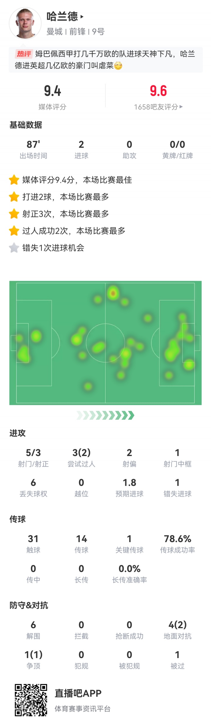 而在進球之外,哈蘭德對曼城的防守也是貢獻不?。?/strong>他憑借強大的身體素質(zhì)多次在本方禁區(qū)中拒絕了曼聯(lián)的傳中進攻,數(shù)據(jù)統(tǒng)計上來看他本場比賽貢獻6次解圍,這個數(shù)據(jù)在雙方球員中只低于他的隊友魯本-迪亞斯(7次),和胡桑諾夫并列全場第二。