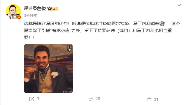 09月17日訊 歐冠首輪,阿森納2-0擊敗畢巴,賽后詹俊發(fā)文點(diǎn)評(píng)。