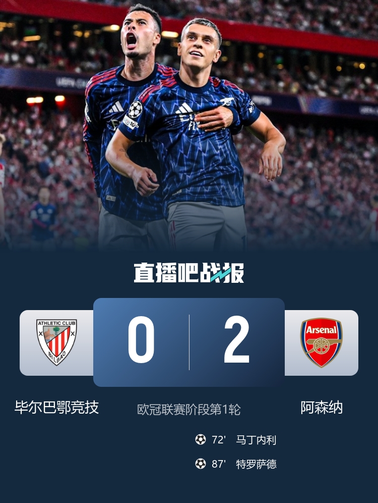 9月17日訊 北京時(shí)間0:45,歐冠聯(lián)賽階段第1輪,阿森納客場(chǎng)挑戰(zhàn)畢爾巴鄂競(jìng)技,比賽在圣馬梅斯球場(chǎng)打響!上半場(chǎng),約克雷斯與加布里埃爾頭部相撞,前者血染賽場(chǎng)!下半場(chǎng),阿爾特塔神換人!替補(bǔ)登場(chǎng)的特羅薩德,助攻替補(bǔ)登場(chǎng)僅1分鐘的馬丁內(nèi)利,后者單刀破門!比賽尾聲階段,馬丁內(nèi)利投桃報(bào)李,助攻特羅薩德再下一城!兩名替補(bǔ)互相傳射建功!最終,阿森納2-0擊敗畢爾巴鄂競(jìng)技,新賽季歐冠開門紅!