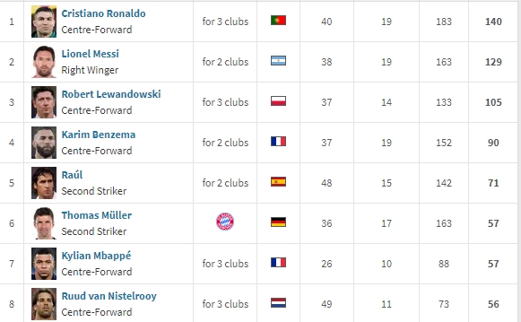 歐冠歷史射手榜:(數(shù)據(jù)來源德轉)