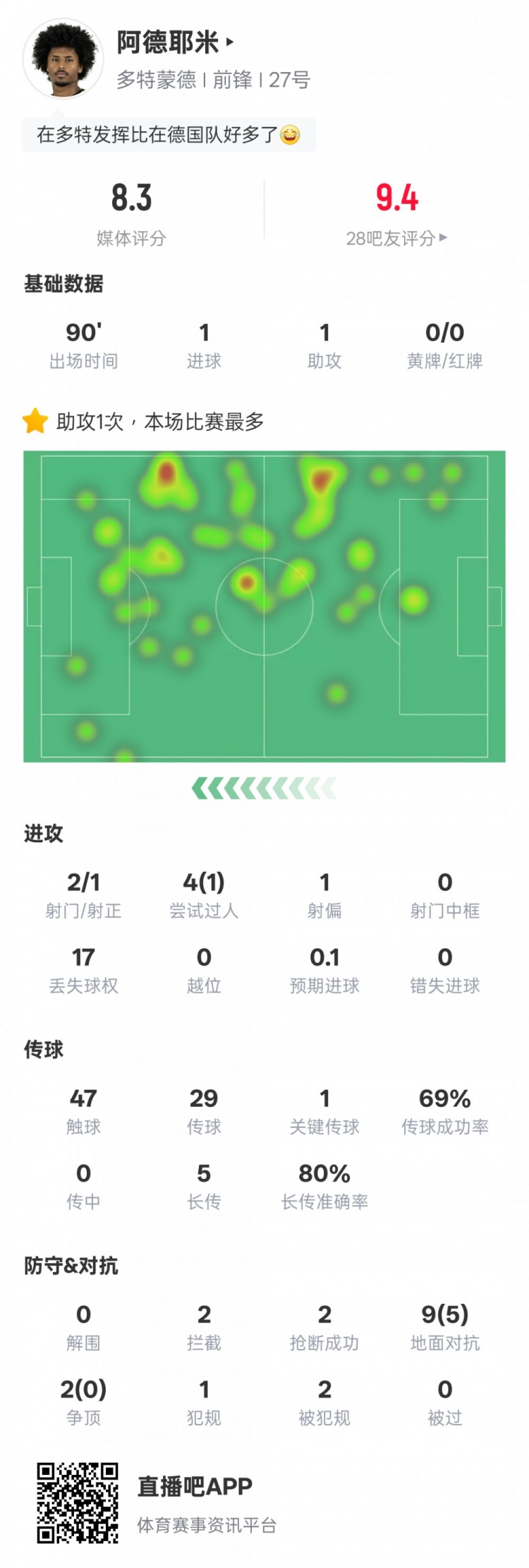 9月17日訊 歐冠聯(lián)賽階段第1輪,多特4-4尤文。阿德耶米首發(fā)出戰(zhàn),傳射建功,還有1次過(guò)人成功和1次關(guān)鍵傳球,評(píng)分8.3。