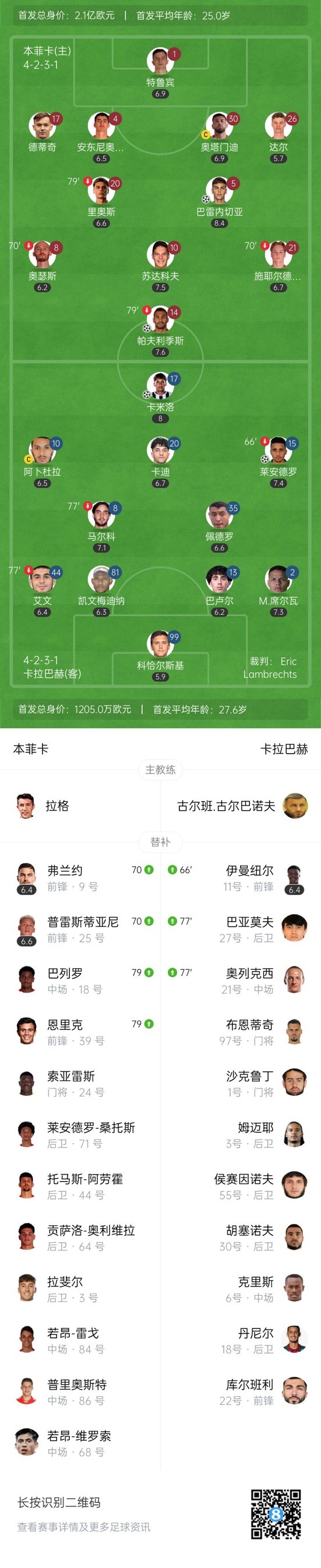 兩隊首發(fā)陣容身價也相差巨大,本菲卡身價2.1億歐元,卡拉巴赫只有1200萬。
