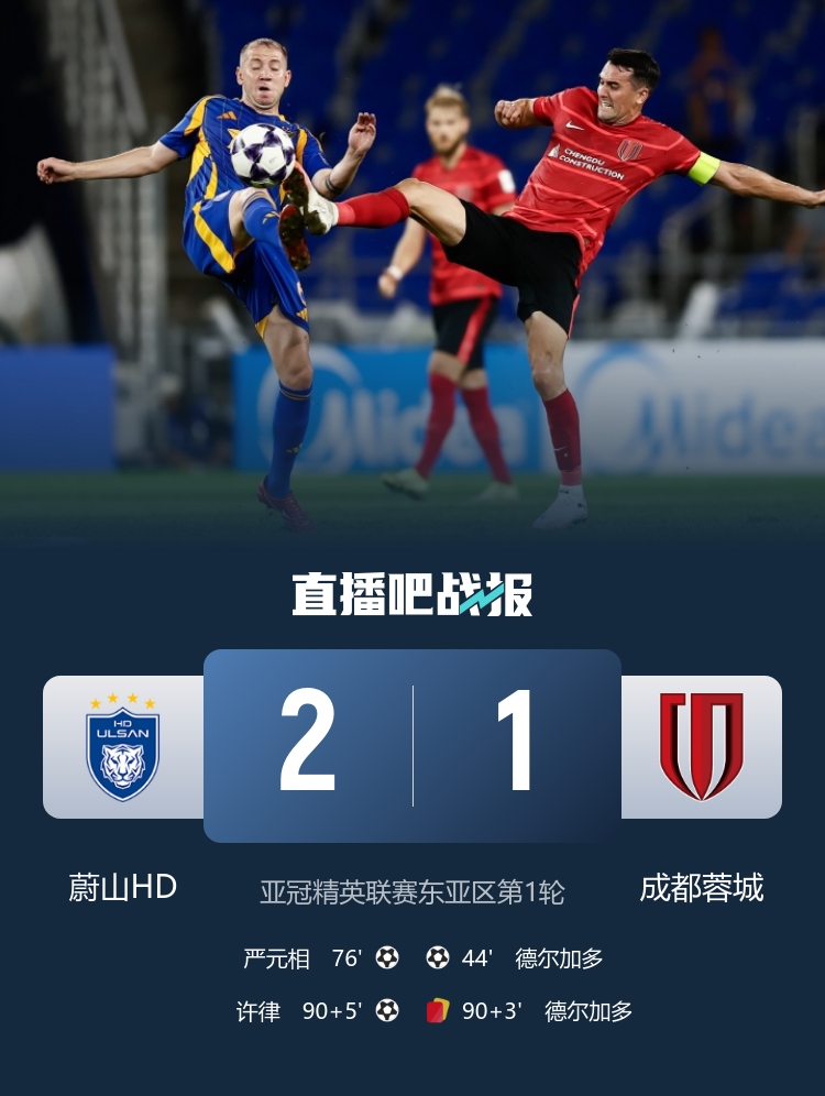 第95分鐘,蔚山HD右路傳中,許律后點(diǎn)抽射絕殺,蔚山HD2-1反超蓉城。↓