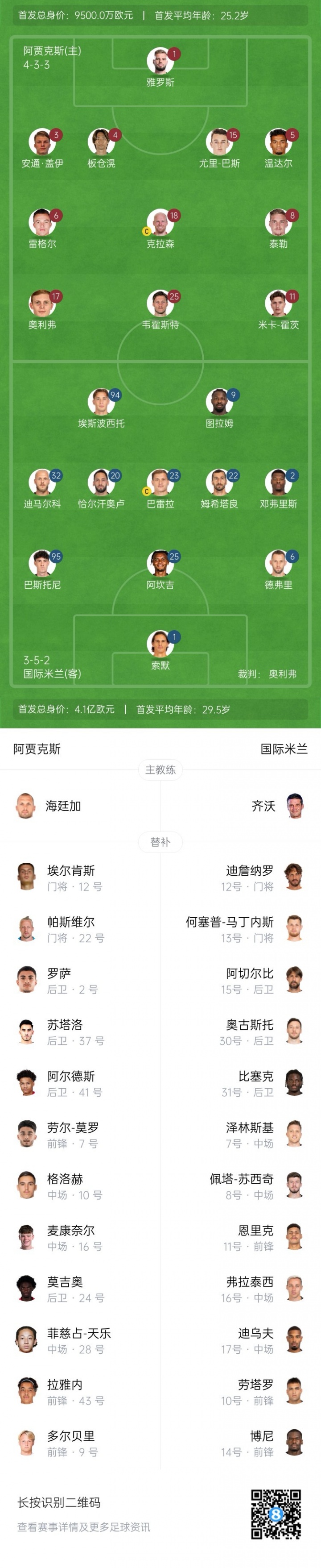 9月18日訊?歐冠聯(lián)賽階段第一輪,阿賈克斯主場迎戰(zhàn)國米比賽即將打響。賽前首發(fā)出爐。