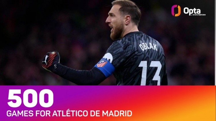 奧布拉克迎來馬競生涯500場里程碑之戰(zhàn),是俱樂部歷史首位實(shí)現(xiàn)如此成就的門將,他的出場次數(shù)僅次于科克(若本場出戰(zhàn)為688場)和阿德拉爾多(550場)。