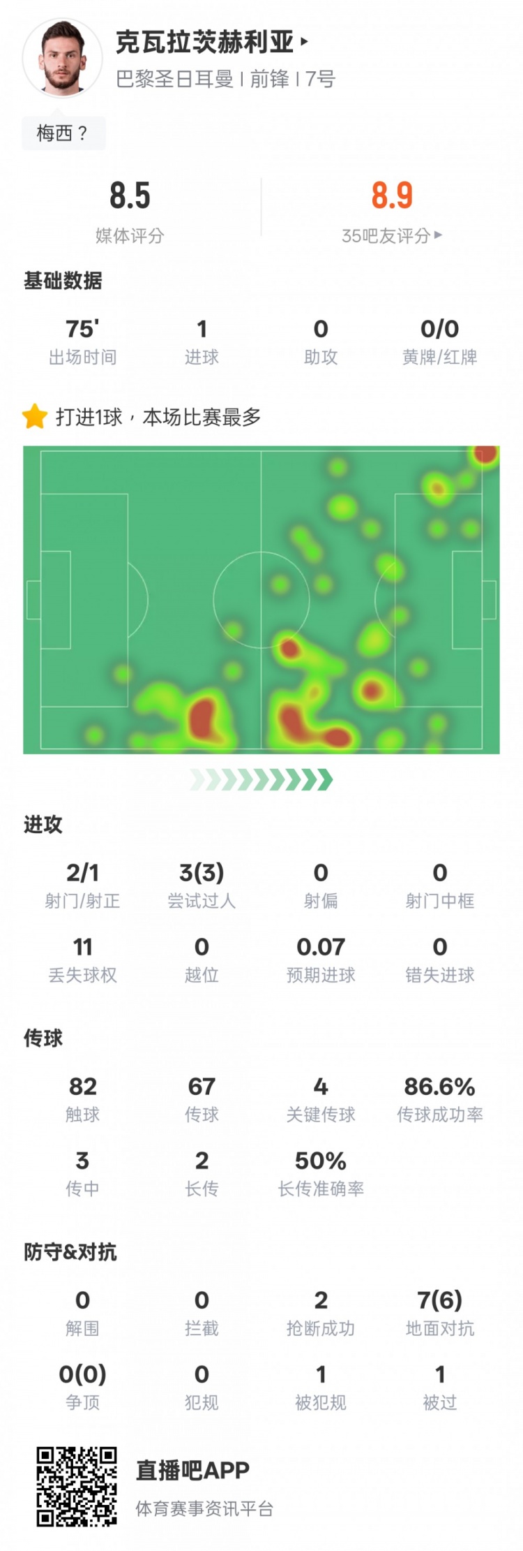 克瓦拉茨赫利亞本場(chǎng)比賽數(shù)據(jù)如下: