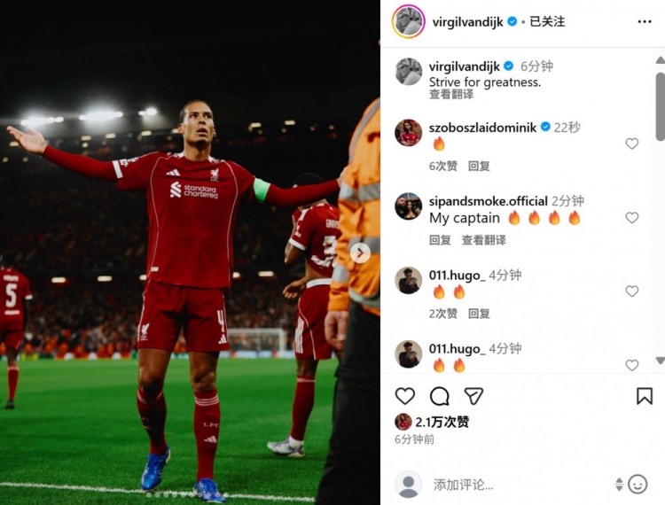 范迪克也在個人社媒曬出慶祝進球照片,配文寫道:“努力追求偉大!”