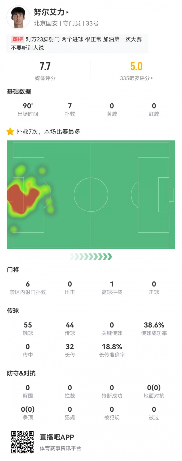 9月18日訊 亞冠二級小組賽E組第1輪,北京國安主場2-2戰(zhàn)平河內(nèi)公安。國安20歲門將努爾艾力首發(fā)出戰(zhàn),本場比賽貢獻(xiàn)7次撲救,1次高球攔截,評分7.7。