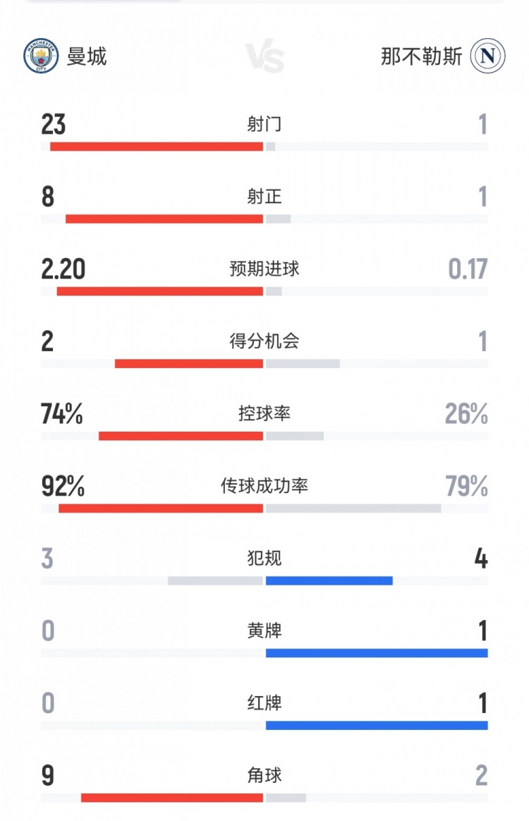 9月19日訊 歐冠首輪,曼城主場(chǎng)2-0戰(zhàn)勝那不勒斯。雙方全場(chǎng)重點(diǎn)數(shù)據(jù)對(duì)比如下↓(主隊(duì)曼城在前)