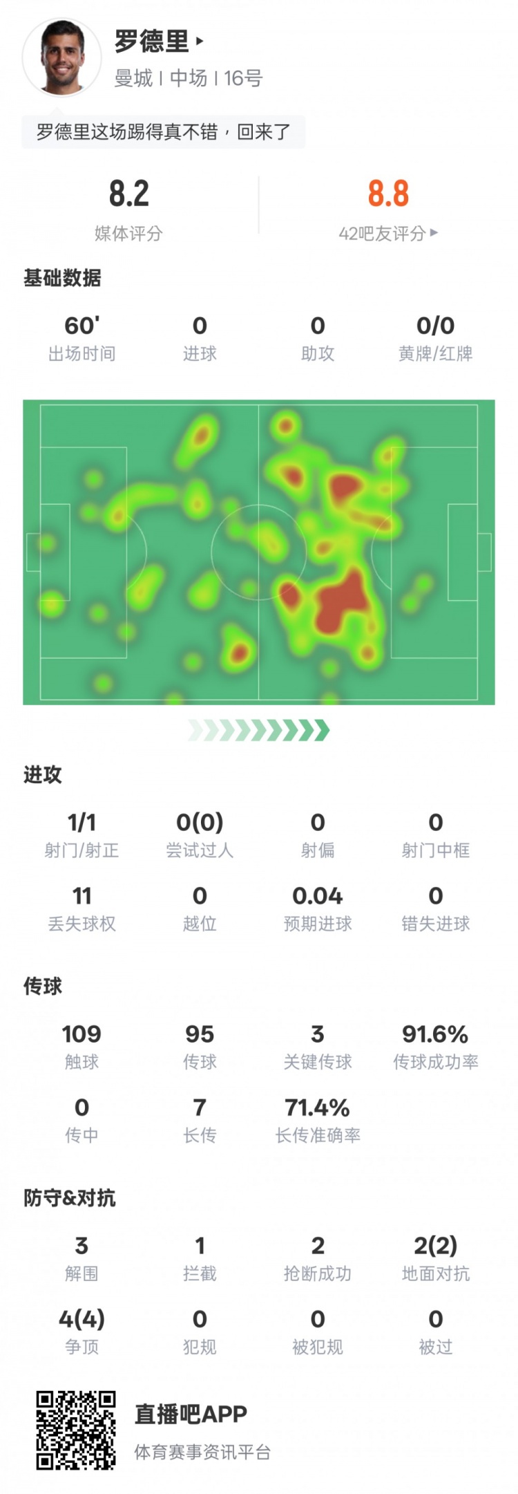 9月19日訊 歐冠聯(lián)賽階段第1輪,曼城對陣那不勒斯,羅德里首發(fā)出戰(zhàn),送出3次關鍵傳球,2次對面對抗和4次爭頂均成功,評分8.2。