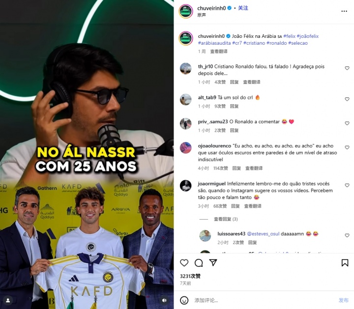 09月19日訊 據(jù)《阿斯報(bào)》報(bào)道,今日在一檔名為“Chuveirinho”的播客節(jié)目中,嘉賓公開(kāi)批評(píng)菲利克斯根本配不上入選葡萄牙國(guó)家隊(duì),C羅則在評(píng)論區(qū)聲援隊(duì)友。
