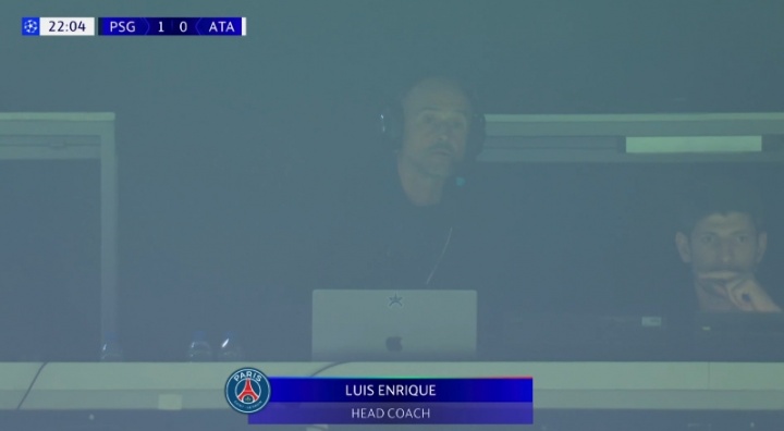 自上周日對陣朗斯的比賽以來,恩里克便開始在媒體看臺頂端的一個較為安靜的角落觀賽并進行指揮。他身邊坐著三名視頻分析師(文森特-布魯內(nèi)、昆汀-比利和安托萬-吉洛坦)以及他的助教之一吉列姆-埃爾南德斯-福爾格拉。