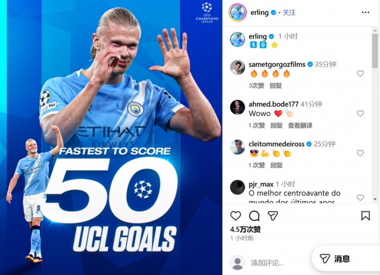 在社交媒體上,哈蘭德曬出了自己最快達(dá)成歐冠50球的海報(bào),顯然這樣的成就令曼城射手非常自豪。
