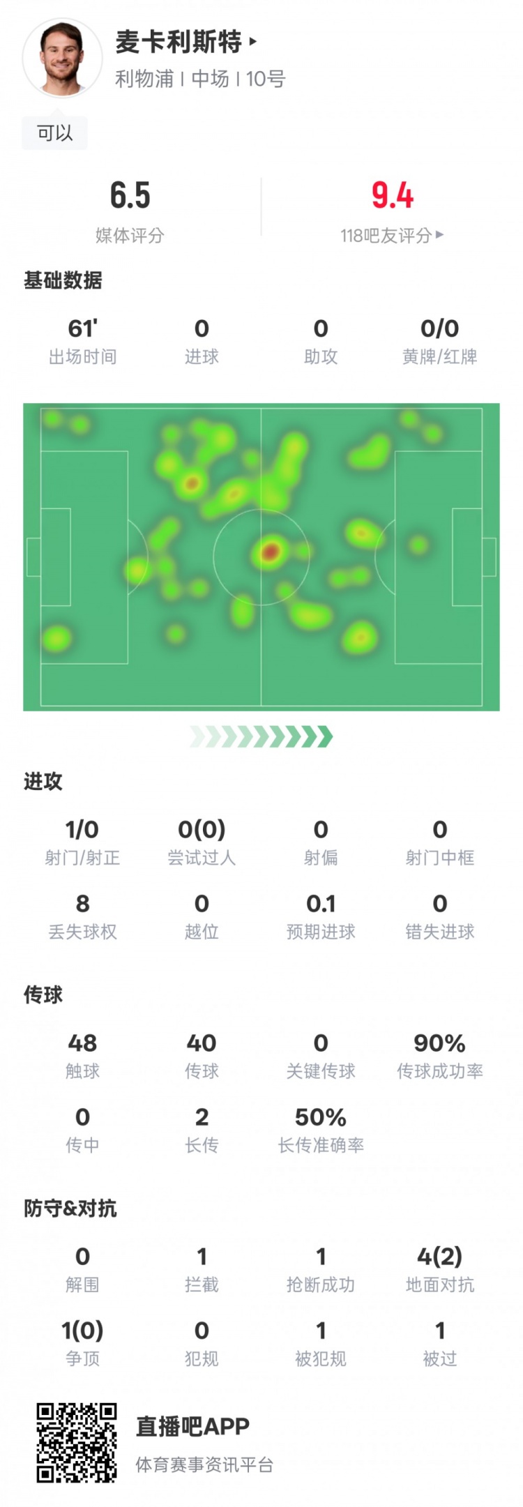 麥卡利斯特本場比賽數據如下:
