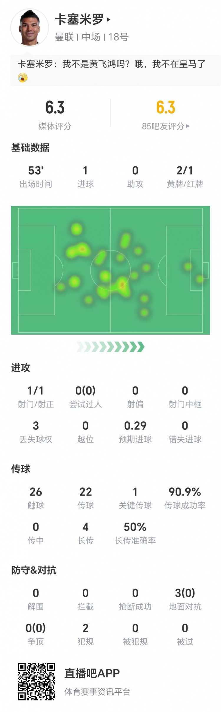 技術(shù)統(tǒng)計數(shù)據(jù)顯示,卡塞米羅1射1正打進1球,3次丟失球權(quán),22次傳球有1次關(guān)鍵傳球,但他3次地面對抗均沒能成功。