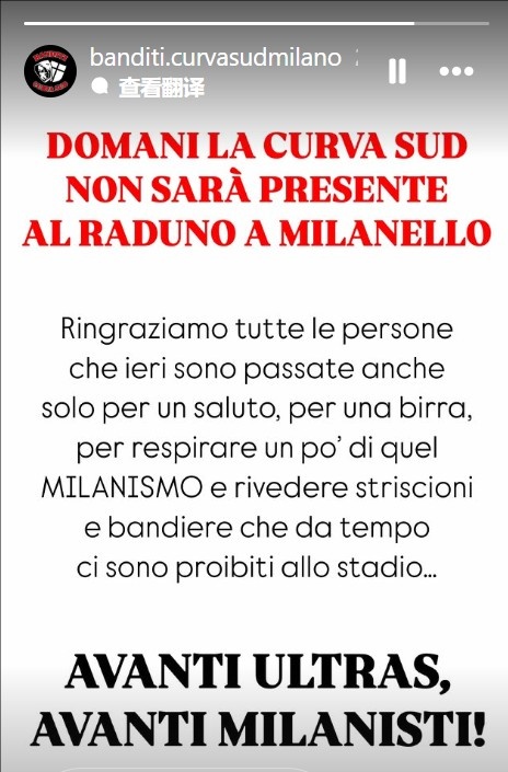 聲明中寫道:“明天我們不會在米蘭內(nèi)洛的季前首訓(xùn)時集結(jié)。我們感謝昨天(在南看臺年終聚會上)所有來訪的朋友,不管是來打個招呼、喝杯啤酒,還是為了感受那份‘米蘭主義’,并重新看到那些早已在球場被禁止的橫幅和旗幟……向前走,Ultras,向前走,紅黑米蘭主義者!”