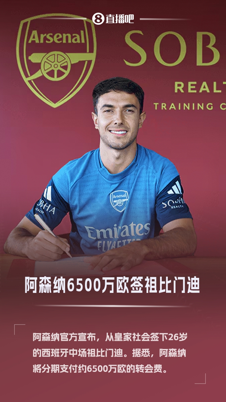 據(jù)羅馬諾消息,阿森納將分期支付轉(zhuǎn)會費,數(shù)額略高于祖比門迪合同中6000萬歐元的解約金,總價大約在6400-6500萬歐左右。西班牙方面的消息稱,祖比門迪與阿森納簽約五年。