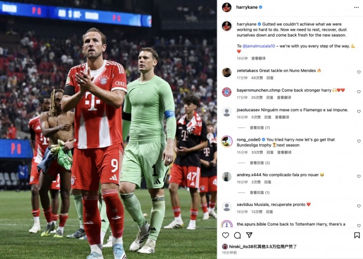 7月6日訊 世俱杯1/4決賽,拜仁0比2不敵巴黎。賽后,凱恩更新社媒表達了對出局的遺憾,同時向穆西亞拉送上鼓勵。