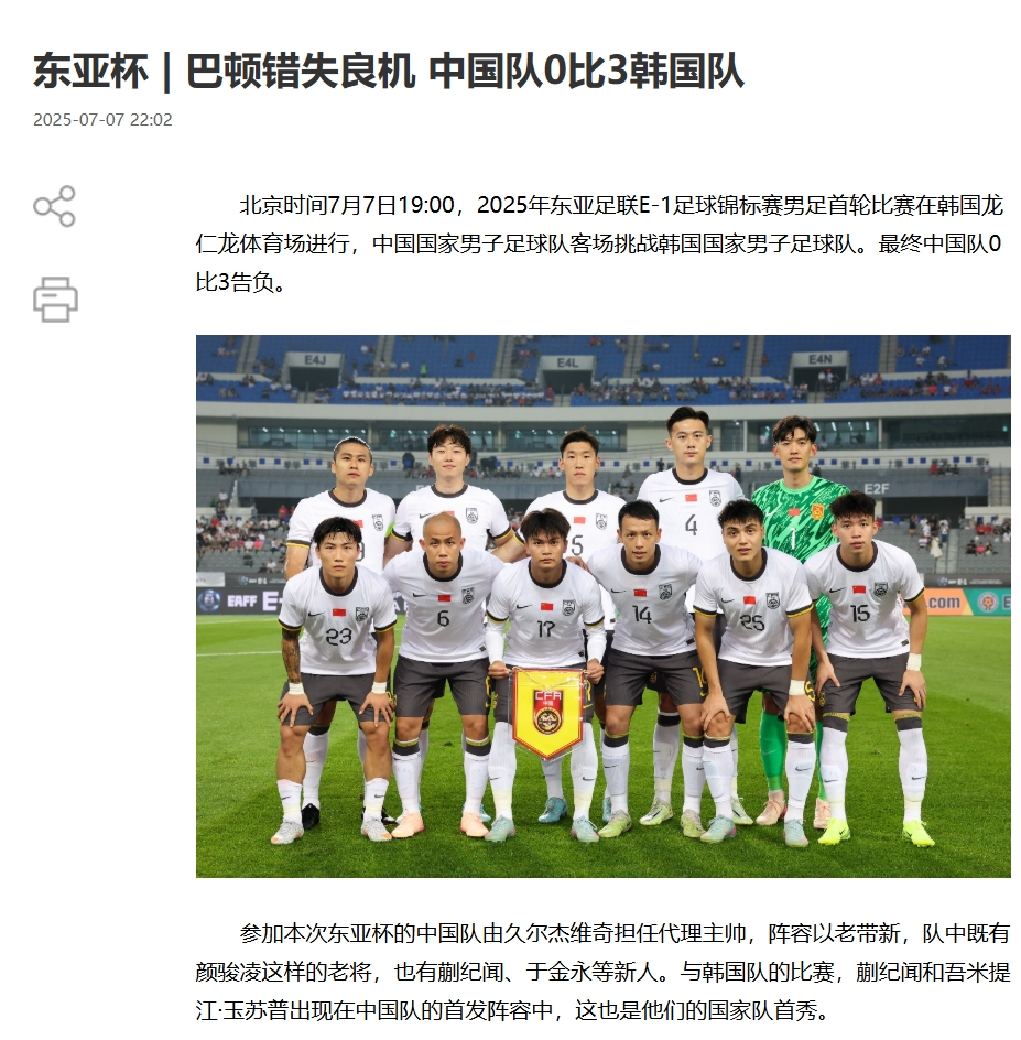 07月07日訊 足協(xié)發(fā)布國足0-3韓國戰(zhàn)報,標題為:東亞杯 | 巴頓錯失良機 中國隊0比3韓國隊