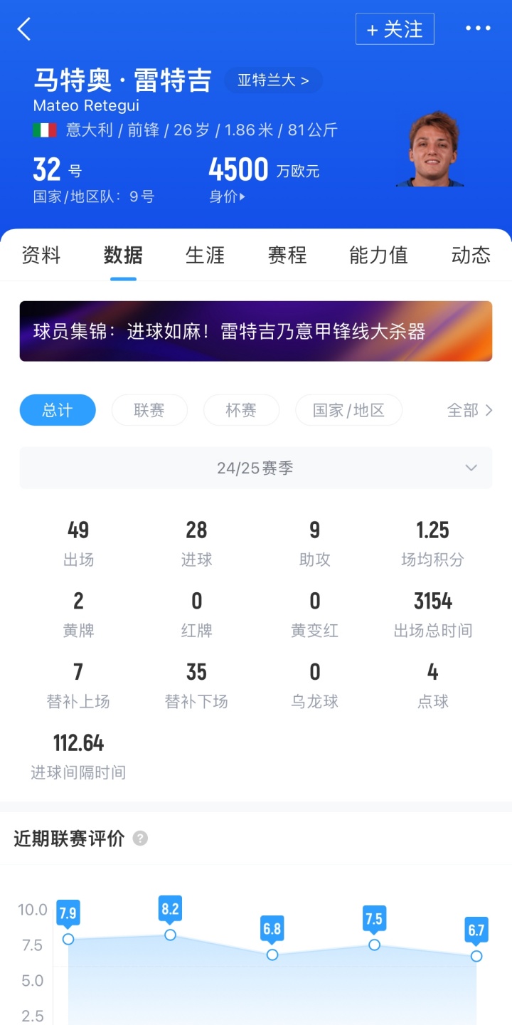 雷特吉上賽季為亞特蘭大各項賽事出場49次,取得了28粒進球和9次助攻,目前其德轉(zhuǎn)身價為4500萬歐元。