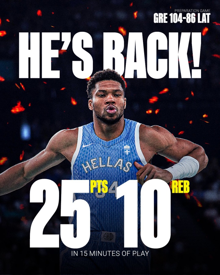 08月21日訊 2025年歐錦賽熱身賽,字母哥迎熱身賽首秀,他率領(lǐng)希臘104-86擊敗拉脫維亞。